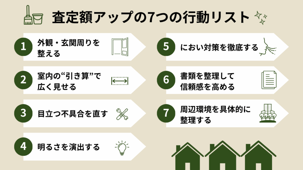 | Q.査定前にリフォームは必要ですか? | A. 高額な全面リフォームは回収が難しいことも。まずは清掃・軽微な補修・照明の見直しなど、費用対効果の高い対策から行いましょう。 |