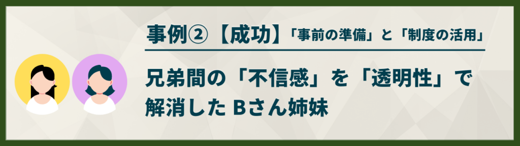 感情が入る余地をなくし、ビジネスライクかつ公平に進めたことで、結果的に姉妹関係も修復。「最後に親孝行ができたね」と笑顔で終わることができました。