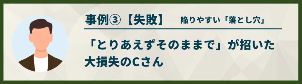 ▼ ここが失敗ポイント 「放置」は、不動産において法的にも資産的にも最大のリスクです。Cさんは以下の3重苦に襲われました。